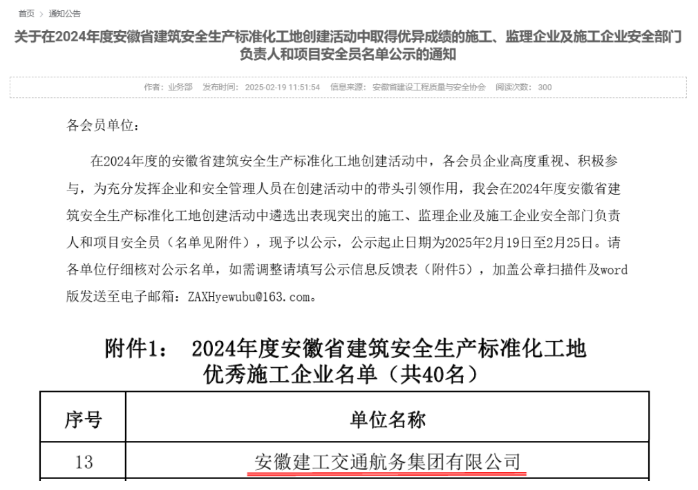 近日,安徽省建筑安全生產(chǎn)標(biāo)準(zhǔn)化工地創(chuàng)建活動結(jié)果揭曉,安徽建工交通航務(wù)集團有限公司憑借扎實的安全管理,斬獲多項殊榮。