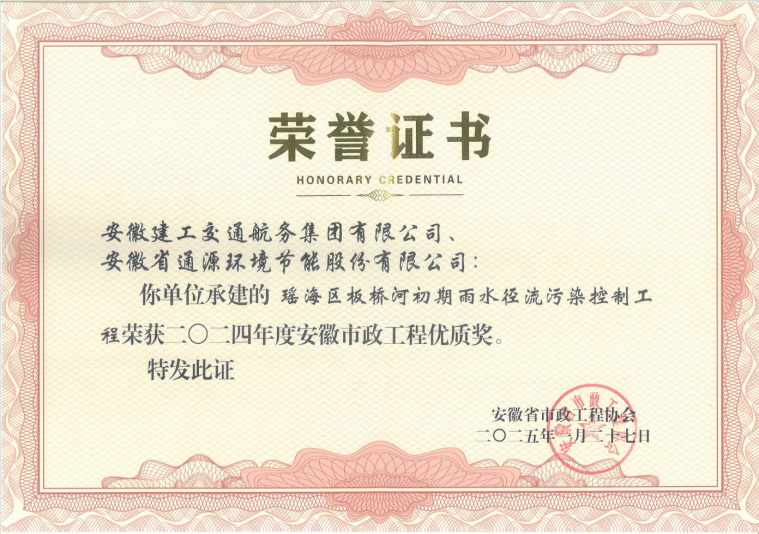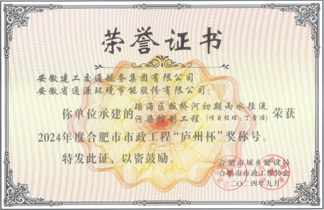 近日,安徽省市政工程協(xié)會公布了2024年度安徽省市政工程優(yōu)質(zhì)獎獲獎項目名單,由公司承建的瑤海區(qū)板橋河初期雨水徑流污染控制工程喜獲2024年度“安徽市政工程優(yōu)質(zhì)獎”。