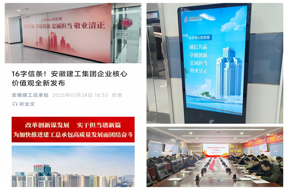 創(chuàng)新載體,增強(qiáng)學(xué)習(xí)宣貫實(shí)效。公司堅(jiān)持“線上線下”雙管齊下,充分運(yùn)用官微、官網(wǎng)等線上平臺(tái),第一時(shí)間推送《16字信條!安徽建工集團(tuán)企業(yè)核心價(jià)值觀全新發(fā)布》學(xué)習(xí)資料,將核心價(jià)值觀融入公司宣傳圖標(biāo);線下利用宣傳欄、電子屏、海報(bào)等載體,廣泛宣傳營造氛圍,增強(qiáng)學(xué)習(xí)的吸引力感染力。
