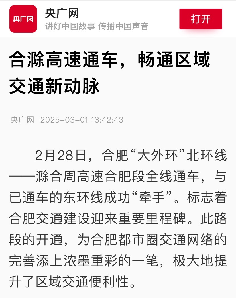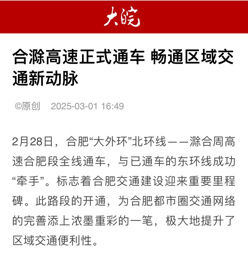 2月28日,建工水利承建的合肥“大外環(huán)”北環(huán)線——滁合周高速合肥段全線通車,與已通車的東環(huán)線成功“牽手”,受到央廣網(wǎng)、大皖新聞等主流媒體關注報道。