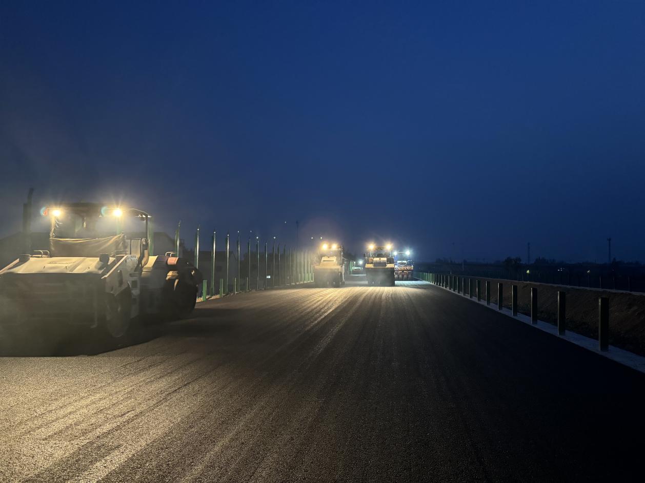 面對地方協(xié)調(diào)、交叉施工、惡劣天氣等不利因素,項(xiàng)目團(tuán)隊(duì)積極與當(dāng)?shù)卣畣挝粶贤?,迅速調(diào)整施工計(jì)劃,組織多班組交叉作業(yè),黨員團(tuán)員帶頭加班加點(diǎn),日夜奮戰(zhàn)在施工一線,自2024年10月至今,水穩(wěn)層完成總工程量的83%,瀝青攤鋪完成總工程量的90%,以高效施工全力推進(jìn)項(xiàng)目建設(shè)。
