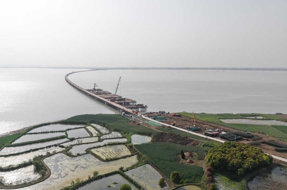 4月2日和8日,城東湖、城西湖兩座鋼便橋相繼合龍,為后續(xù)項目建設(shè)打通了“任督二脈”,標(biāo)志著項目物資運(yùn)輸和機(jī)械調(diào)度的“生命線”全線貫通,特大橋?qū)⒄竭M(jìn)入施工建設(shè)階段。