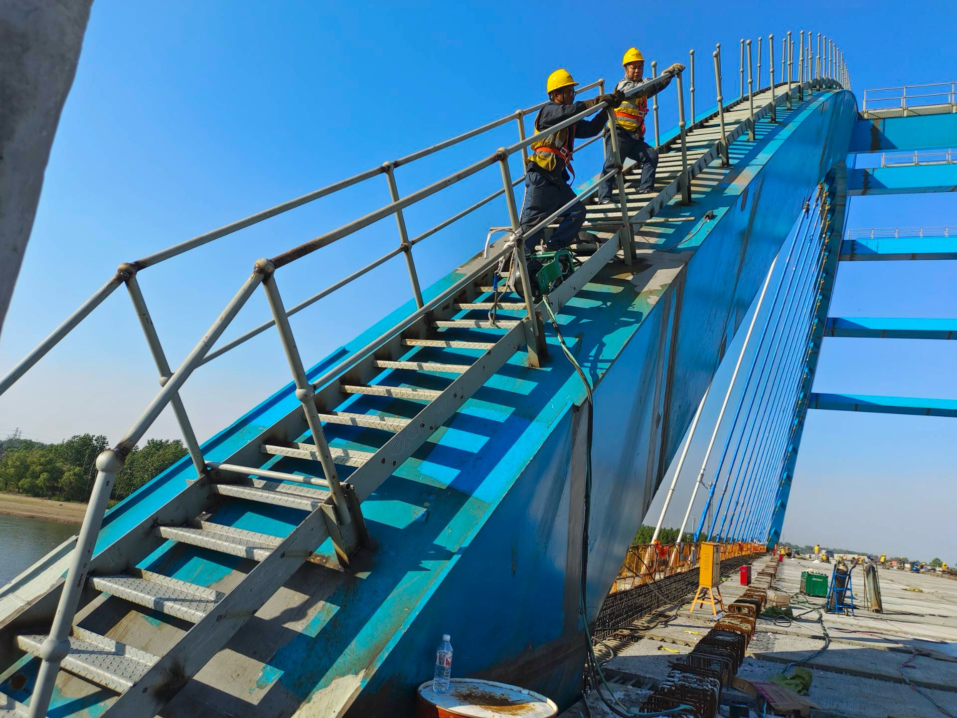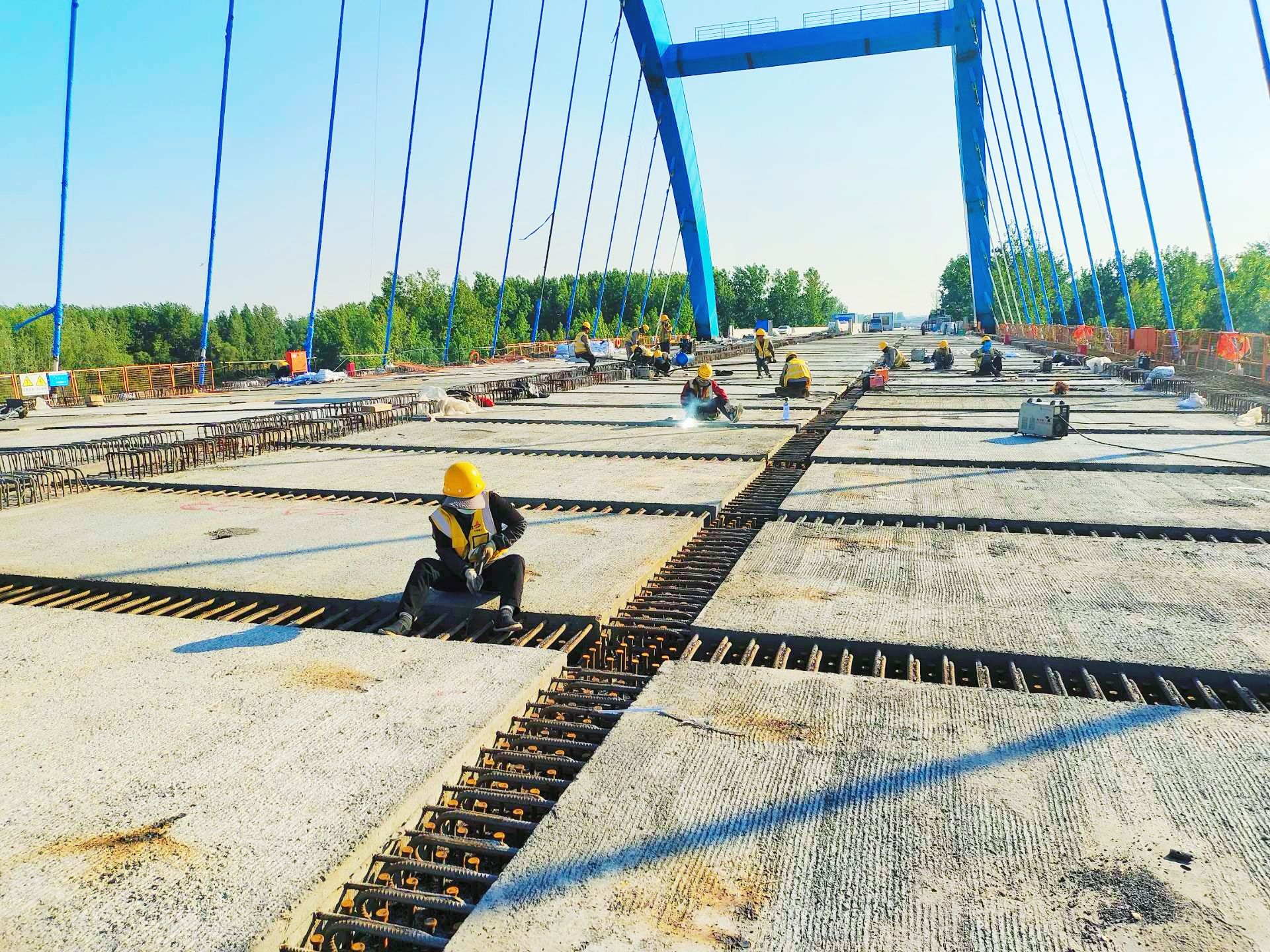 為確保5月底實現(xiàn)大橋全線竣工,20余名作業(yè)人員實行24小時全天候輪值施工,同步推進引橋橋面鋪裝、吊桿張拉、主橋橋面板鋪裝、橋面系澆筑以及護欄安裝等多項作業(yè)任務。