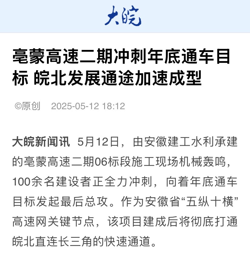 5月12日,建工水利亳蒙高速二期06標施工現(xiàn)場機械轟鳴,100余名建設者正夜以繼日、全力沖刺,向著年底全線通車目標發(fā)起最后總攻。作為安徽省“五縱十橫”高速網(wǎng)關鍵節(jié)點,項目建成后將徹底打通皖北直連長三角的快速通道。此前,該項目建設期間,多次受到安徽日報、大皖新聞、中安在線等主流媒體關注報道。
