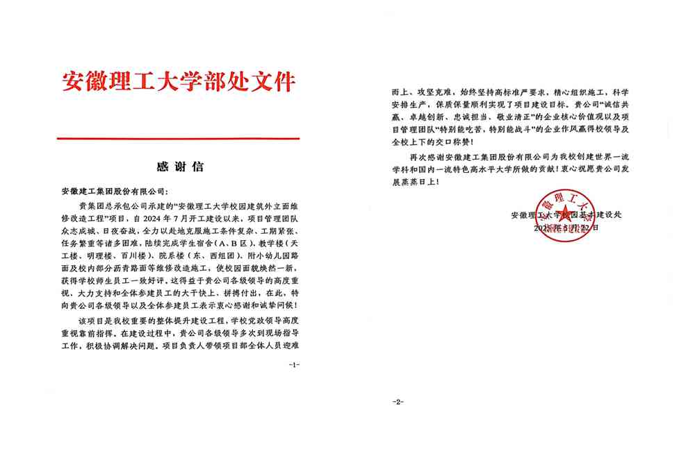近日,安徽理工大學(xué)給安徽建工集團(tuán)發(fā)來(lái)感謝信。信中對(duì)建工總承包公司精心組織施工、科學(xué)安排生產(chǎn)、高標(biāo)準(zhǔn)高質(zhì)量完成安徽理工大學(xué)校園建筑外立面維修改造工程項(xiàng)目給予好評(píng),對(duì)安徽建工集團(tuán)助力其創(chuàng)建世界一流學(xué)科和國(guó)內(nèi)一流特色高水平大學(xué)表示感謝。