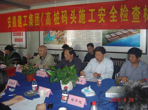 合肥港項目部經(jīng)理向與會人員匯報了合肥港的概況、施工進度、示范工程實施情況等。路港公司副總經(jīng)理張瓊對合肥港綜合碼頭一期工程創(chuàng)建過程進行匯報。郭道真介紹了《高樁碼頭施工安全檢查標(biāo)準(zhǔn)》起草情況,肯定了合肥港項目的管理水平和創(chuàng)建工作。