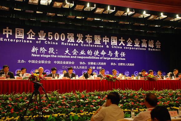 2010 Top 500 Enterprises of China Release Conference & China Corporations Summit opened in Anhui International Exhibition Centre on the afternoon of September 4th. Mr. Wang Zhongyu, former Vice Chairman of CPPCC National Committee and President of China Enterprise Confederation and China Entrepreneurs Association made a keynote speech. Mr. Wang Sanyun, Governor of Anhui province and Mr. Huang Shuhe, Deputy Director of State-owned Assets Supervision and Administration Commission of the State Council addressed for the conference. Mr. Li Decheng, Vice President of China Enterprise Confederation and China Entrepreneurs Association presided over the conference. Also present at the conference were Mr. Sun Jinlong, Member of Standing Committee of CPC Anhui Provincial Committee and Secretary of CPC Hefei Municipal Committee, Mr. Huang Haisong, Vice Governor of Anhui province, Mr. Wang Heling, Vice Chairman of CPPCC Anhui Provincial Committee, Mr. Jiang Qiangui, Mr. Wang Jiming, Mr. Yin Yuanping, Executive Vice Presidents of China Enterprise Confederation, Mr. Liang Weiguo, Secretary-General of Anhui Provincial Government. Representatives of Top 500 Chinese enterprises, multinational corporations, scholars and government departments were also present at the conference.
