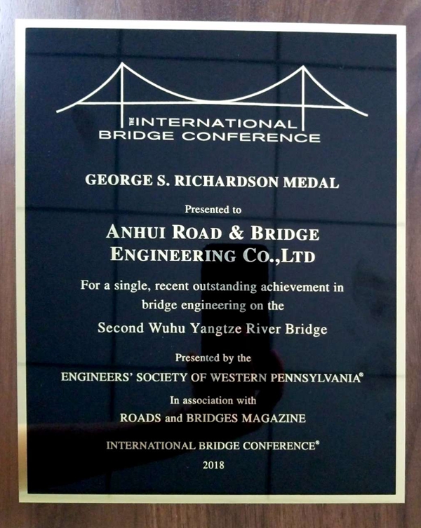 In June 2018, the Second Wuhu Yangtze River Bridge co-built by Anhui Road & Bridge Engineering Company – a subsidiary of ACEG professional for road and bridge engineering and construction, has been awarded the prestigious 35th International Bridge Conference (IBC) George S. Richardson Medal. The George S. Richardson Medal honors a single, recent outstanding achievement in bridge engineering and it is the highest award of the international bridge conference (IBC) - George Richardson award, which was also the first time for the Company won the international award.