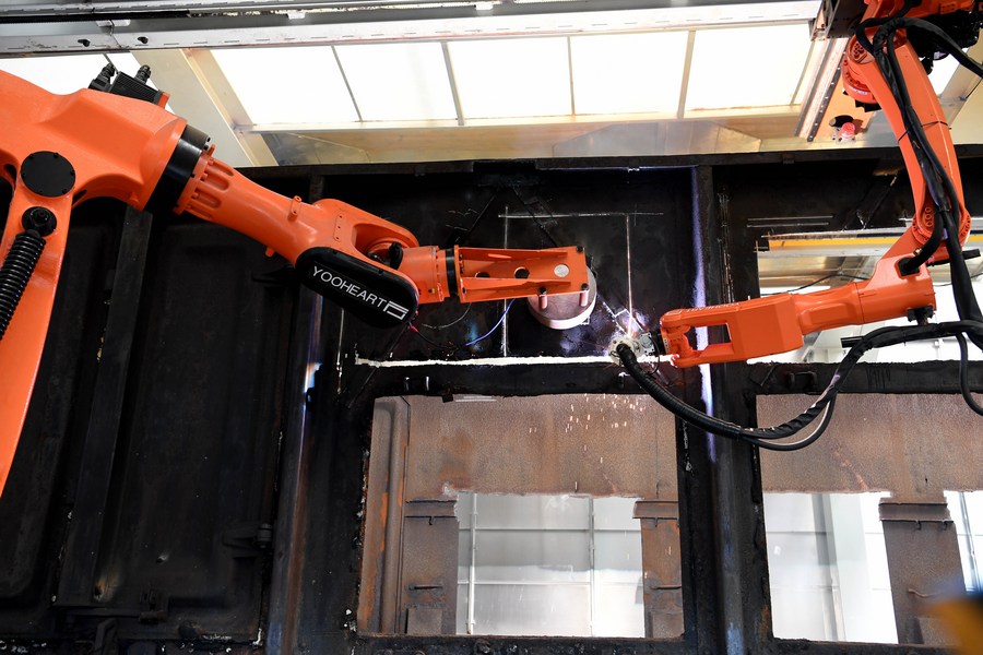 Robots dismantle automatically a scrap freight wagon at the intelligent production base for recycling railway materials in Ma'anshan, east China's Anhui Province, July 14, 2021. (Xinhua/Liu Junxi)