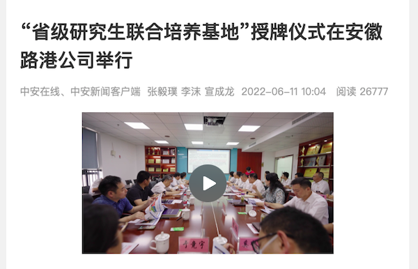 Zhong’an online - a major news media in Anhui province, reported on June 11, the awarding ceremony of the“Anhui Provincial Joint Training Base for Graduate Students” was held at the office building of ACEG Road and Port Construction Engineering Company Limited in Hefei city, the capital of eastern China’s Anhui province.