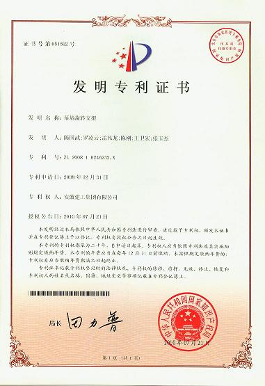 2010年7月21日,國家知識產(chǎn)權(quán)局授予安徽建工集團(tuán)“幕墻旋轉(zhuǎn)支架”發(fā)明專利權(quán),并頒發(fā)了“發(fā)明專利證書”。