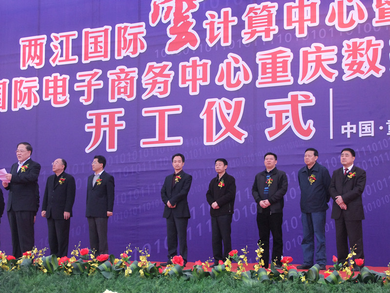 在4月6日的兩江新區(qū)兩江國際云計算中心奠基啟動儀式上,重慶市市長黃奇帆為兩江國際云計算中心授牌、市領(lǐng)導(dǎo)翁杰明、童小平參加開工儀式。集團公司董事長胡運成出席開工儀式并為重慶兩江新區(qū)兩江國際云計算中心暨中國國際電子商務(wù)中心重慶數(shù)據(jù)產(chǎn)業(yè)園奠基。隨同胡運成董事長參加儀式的有集團公司副總經(jīng)理王元曦、二建公司總經(jīng)理費瑞林、國內(nèi)公司總經(jīng)理陳傳文等。