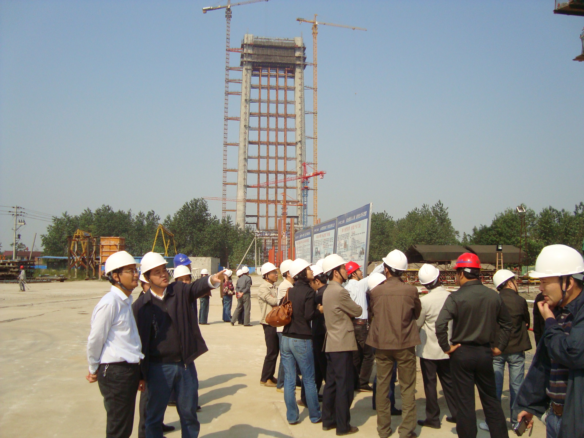 大家一到馬鞍山就集聚在大橋指揮部會議室,指揮部殷永高處長代表馬橋指揮部對安徽建工集團(tuán)觀摩團(tuán)一行表示熱烈歡迎,希望雙方增進(jìn)交流,并期待與安徽建工集團(tuán)今后在長江大橋建設(shè)領(lǐng)域進(jìn)一步合作。殷處長簡要說明了2008年開工以來大橋的基本建設(shè)情況,重點(diǎn)介紹了馬橋項(xiàng)目質(zhì)量安全管理方面所采取的創(chuàng)新管理方法和在科技創(chuàng)新上所取得的一系列重大突破:建立完善的質(zhì)量管理體系,實(shí)行精細(xì)化管理,推進(jìn)生產(chǎn)質(zhì)量安全信息化管理,組織編制出版了《施工質(zhì)量標(biāo)準(zhǔn)化》和《施工安全標(biāo)準(zhǔn)化》;開展了“根鍵式鉆孔灌注樁”、“根式沉井基礎(chǔ)”、“根式錨碇基礎(chǔ)”以及“多塔連跨懸索橋非飄移結(jié)構(gòu)體系研究”、“ 千米級三塔懸索橋上部結(jié)構(gòu)安裝關(guān)鍵技術(shù)研究”、“ 拱塔斜拉橋關(guān)鍵技術(shù)及模型試驗(yàn)研究”、“三塔懸索橋施工與運(yùn)營關(guān)鍵狀態(tài)極限承載能力研究” 等關(guān)鍵技術(shù)研究。同時為滿足中塔鋼節(jié)段的吊裝要求,組織研發(fā)了D5200-240型世界最大噸位塔吊。上述多項(xiàng)技術(shù)達(dá)到世界領(lǐng)先水平,獲得多項(xiàng)發(fā)明專利。
