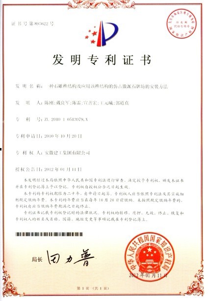 安徽建工集團(tuán)有限公司申報(bào)的“一種石雕榫結(jié)構(gòu)及應(yīng)用該榫結(jié)構(gòu)的仿古徽派石牌坊的安裝方法”通過了國(guó)家知識(shí)產(chǎn)權(quán)局最終審核,并于近日收到了“發(fā)明專利證書”(專利號(hào):ZL 2010 1 0513079.X)。該發(fā)明專利自國(guó)家知識(shí)產(chǎn)權(quán)局2012年1月11日授權(quán)之日起,專利權(quán)期限為20年。