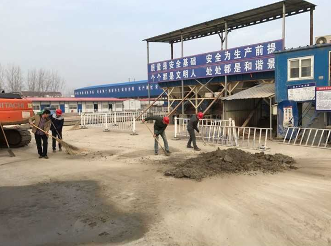 在后場的場站大門、分區(qū)隔離帶、拌合站等處,突擊隊員們有的掃、有的鏟、有的運(yùn)、有的推,個個干勁使足,有條不紊地對各處的塵土、淤泥、結(jié)塊混凝土進(jìn)行清理。