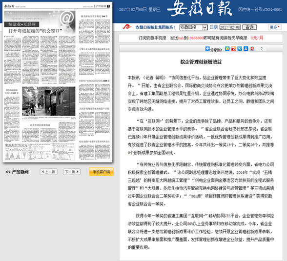 2月8日,《安徽日報》在產(chǎn)經(jīng)新聞版塊中發(fā)表《皖企管理創(chuàng)新增效益》一文,文章高度評價集團CES協(xié)同平臺建設成效。