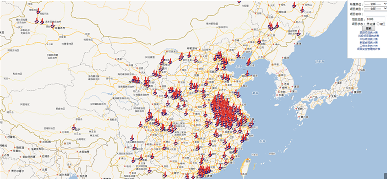 該系統(tǒng)對(duì)集團(tuán)所屬各施工類企業(yè)的工程項(xiàng)目進(jìn)行統(tǒng)一管理和掌控,通過項(xiàng)目管理地圖系統(tǒng)清晰而詳盡地展現(xiàn)集團(tuán)所有項(xiàng)目信息,提高項(xiàng)目管控的能力和水平。集團(tuán)領(lǐng)導(dǎo)、市場經(jīng)營部、工程管理部、安監(jiān)局及其他相關(guān)部門負(fù)責(zé)人和所屬單位領(lǐng)導(dǎo)、市場經(jīng)營部、工程管理、安監(jiān)局及其他相關(guān)部門負(fù)責(zé)人均可以對(duì)進(jìn)入集團(tuán)實(shí)時(shí)項(xiàng)目地圖系統(tǒng)的項(xiàng)目信息依據(jù)不同權(quán)限通過系統(tǒng)平臺(tái)進(jìn)行查詢和定位。