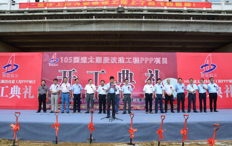 7月8日,105國道太湖段改建工程PPP項目舉行隆重開工儀式,太湖縣委縣政府領導與安徽建工集團有限公司領導共同出席開工典禮。集團公司副總經理王厚良,安建投資公司總經理、黨總支副書記朱忠明,安徽路港公司董事長、總經理李振標等分別致辭,太湖縣委書記程志翔宣布項目正式開工。太湖縣交通運輸局、縣公路局、縣指揮部、安建投資公司、施工單位、監(jiān)理單位、沿線各鄉(xiāng)鎮(zhèn)代表等200余人參加此次典禮。