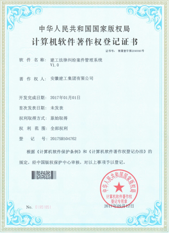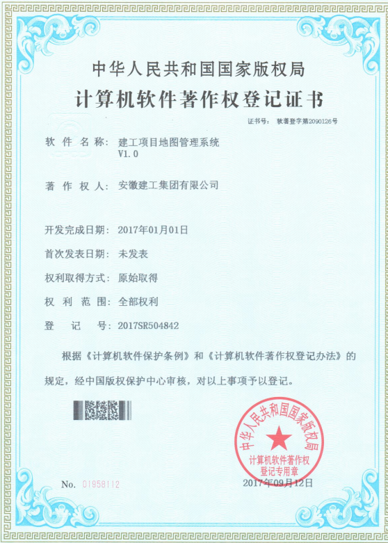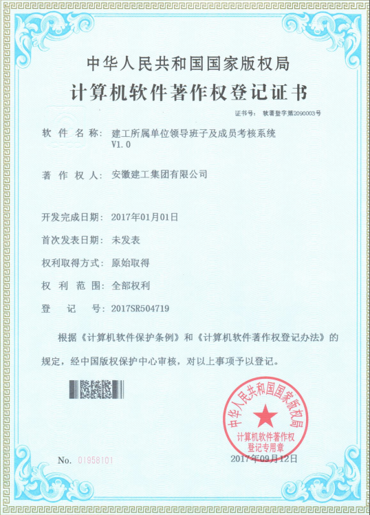 近日,根據(jù)《計(jì)算機(jī)軟件保護(hù)條例》和《計(jì)算機(jī)軟件著作權(quán)登記辦法》的規(guī)定,經(jīng)中國(guó)版權(quán)保護(hù)中心審核,中華人民共和國(guó)國(guó)家版權(quán)局對(duì)集團(tuán)提交的“建工項(xiàng)目地圖管理系統(tǒng)”、“建工法律糾紛案件管理系統(tǒng)”、“建工所屬單位領(lǐng)導(dǎo)班子及成員考核系統(tǒng)”等著作權(quán)認(rèn)定為原始取得并予以登記,從頒證之日起,這3項(xiàng)系統(tǒng)軟件的版權(quán)將得到中國(guó)版權(quán)保護(hù)中心的有效保護(hù)。