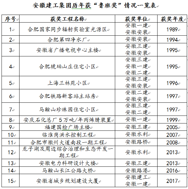 2017年11月6日,中國建筑業(yè)協(xié)會“紀(jì)念魯班獎創(chuàng)立30周年暨2016-2017年度創(chuàng)精品工程經(jīng)驗(yàn)交流會”在北京隆重召開。安徽建工集團(tuán)有限公司承建(安徽省第一建筑工程有限公司參建)的“安徽省城鄉(xiāng)規(guī)劃建設(shè)大廈”和安徽路港工程有限責(zé)任公司參建的“馬鞍山長江公路大橋”兩項(xiàng)工程喜獲2016年-2017年度中國建設(shè)工程“魯班獎(國家優(yōu)質(zhì)工程)”。自1987年“魯班獎”創(chuàng)立以來安徽建工集團(tuán)有限公司共獲15項(xiàng)“魯班獎(國家優(yōu)質(zhì)工程)”,經(jīng)申報(bào)評選在此次表彰會上被授予“創(chuàng)建魯班獎工程優(yōu)秀企業(yè)(承建單位)”榮譽(yù)稱號, 充分體現(xiàn)了國有大型特級施工總承包企業(yè)的榜樣引領(lǐng)和示范帶頭作用,最好地詮釋了“誠信、創(chuàng)新、優(yōu)質(zhì)、共贏”的安徽建工經(jīng)營理念。