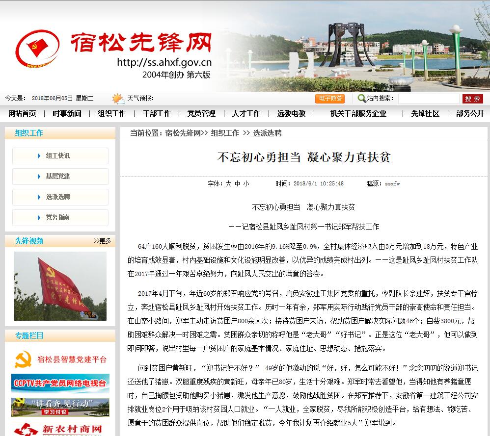 6月1日,《宿松先鋒網(wǎng)》以《不忘初心勇?lián)?dāng) 凝心聚力真扶貧》為題,對(duì)安徽建工集團(tuán)自2017年4月以來(lái),積極響應(yīng)黨和國(guó)家號(hào)召,情系貧困群眾、創(chuàng)新扶貧方式的典型做法和顯著成效等進(jìn)行了專題報(bào)道。