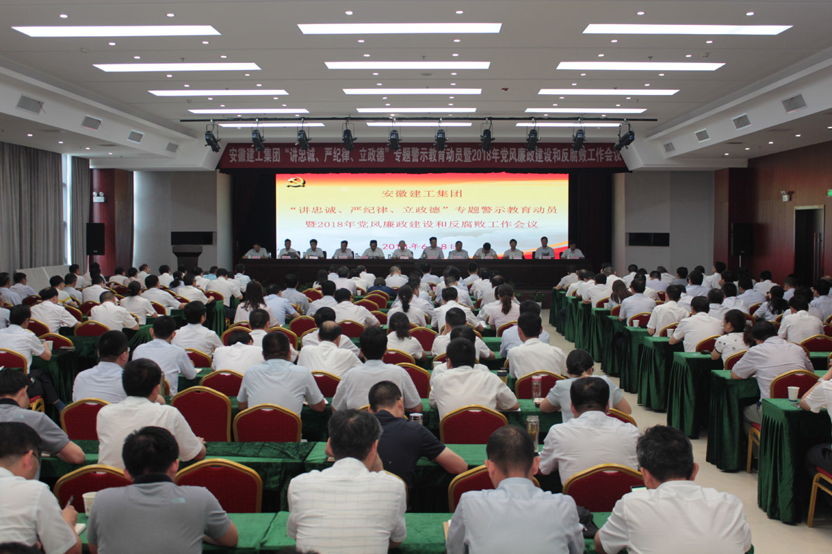 6月8日下午,安徽建工集團“講忠誠、嚴紀律、立政德”專題警示教育動員暨2018年黨風廉政建設和反腐敗工作會議在安建大廈三樓會議室召開。集團公司黨委書記、董事長趙時運出席會議并講話;集團公司總經(jīng)理、董事、黨委副書記劉家靜傳達有關案件警示材料;集團公司黨委副書記牛曙東傳達省國資系統(tǒng)“講忠誠、嚴紀律、立政德”專題警示教育動員會精神以及省委巡視有關情況通報;集團公司黨委委員、紀委書記宋志華結合學習貫徹省屬企業(yè)黨風廉政建設和反腐敗工作會議精神作工作安排。
