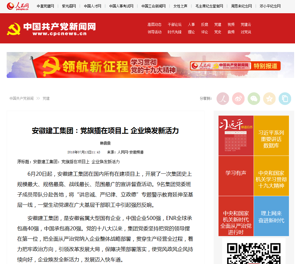 日前,安徽建工集團黨建工作受到中央主流新聞媒體重點宣傳,人民網(wǎng)、中國共產(chǎn)黨新聞網(wǎng)、人民網(wǎng)安徽頻道等以《安徽建工:黨旗插在項目上 企業(yè)煥發(fā)新活力》為題刊發(fā)記者專稿文章,點贊集團公司黨建工作。當(dāng)天,該稿件在安徽省屬企業(yè)黨建網(wǎng)、人民網(wǎng)安徽頻道官方微信、安徽國資黨建官方微信以頭條同步刊出。