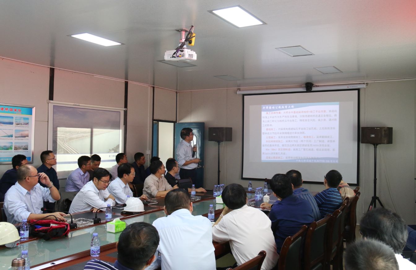 隨后,觀摩團乘船來到大橋局福平鐵路FPZQ-3標項目部,在項目會議室,雙方舉行了觀摩交流會議。中鐵大橋局副總工程師兼項目總工程師王東輝用視頻、PPT形式向觀摩團一行講解了平潭海峽公鐵兩用大橋項目的工程概況及特點和難點、項目主要創(chuàng)新點、項目施工組織管理、主要施工方案、項目質量安全管理、四新技術、科研情況及項目最新進展。項目經(jīng)理姚華等就觀摩人員提出的問題一一做了解答,并交流了個人體會。