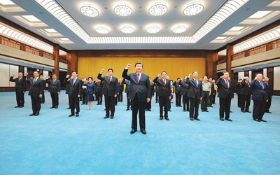 參觀結(jié)束后,習(xí)近平等黨員領(lǐng)導(dǎo)同志來到黨史展覽館紅色大廳。面向鮮紅的中國(guó)共產(chǎn)黨黨旗,習(xí)近平舉起右拳,帶領(lǐng)領(lǐng)導(dǎo)同志重溫入黨誓詞,鏗鏘有力的宣誓聲響徹大廳。