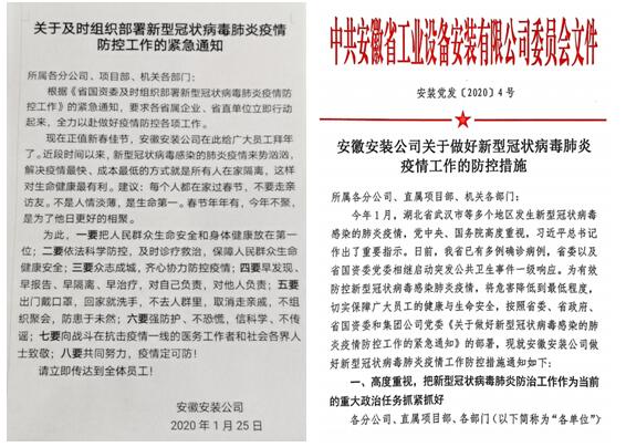 二是部署到位。疫情防控工作開展后,1月25日(大年初一)安徽安裝公司發(fā)出防控疫情工作的緊急通知,1月27日制定肺炎疫情防控措施,對疫情防控工作進行細化安排,周密部署。要求各分公司、直屬項目部、各部門要以對職工群眾生命安全高度負責(zé)的態(tài)度,精準施策,堅決遏制疫情在安徽安裝公司輸入、蔓延,鼓勵職工戴口罩、勤洗手、多通風(fēng)、少走動、常消毒。
