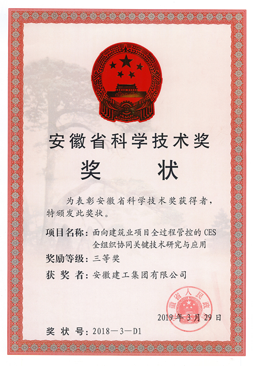 4月11日,安徽省科學(xué)技術(shù)獎(jiǎng)勵(lì)大會在合肥隆重召開,省委書記李錦斌,中科院院長白春禮,省長李國英等出席大會,集團(tuán)公司主持申報(bào)的《面向建筑業(yè)項(xiàng)目全過程管控的CES全組織協(xié)同關(guān)鍵技術(shù)研究與應(yīng)用》榮獲安徽省科技進(jìn)步獎(jiǎng)三等獎(jiǎng),這是集團(tuán)公司信息化建設(shè)過程中首次獲得的安徽省科學(xué)技術(shù)獎(jiǎng)。
