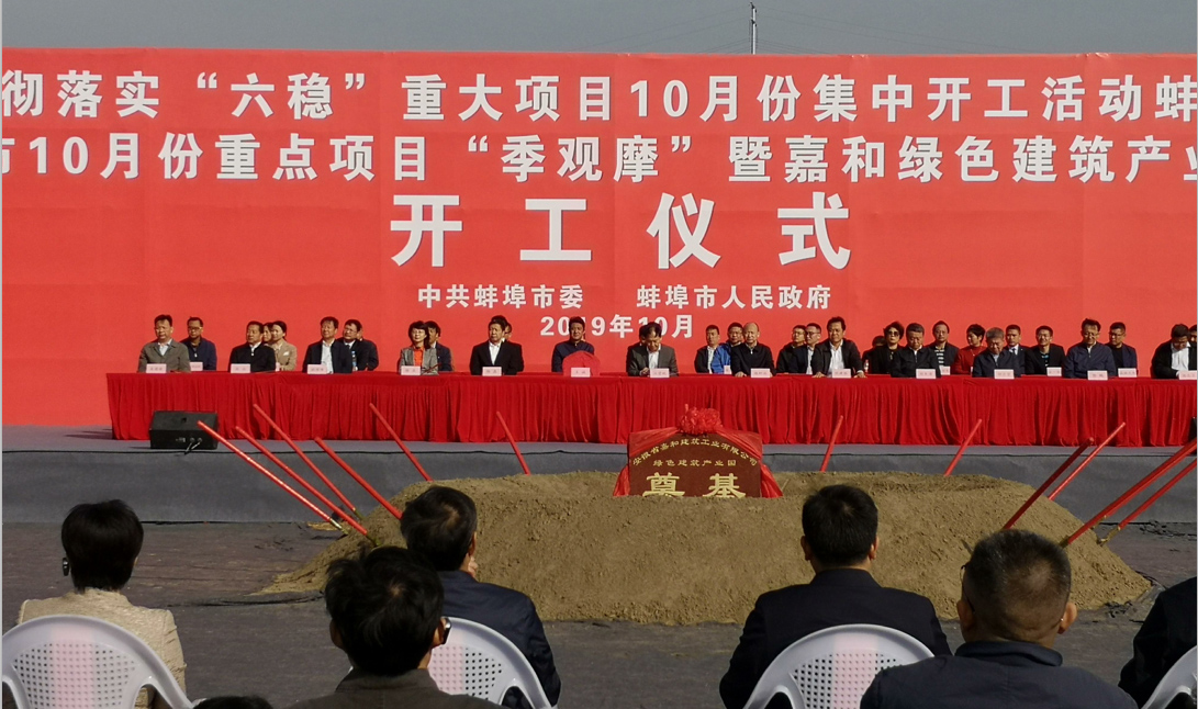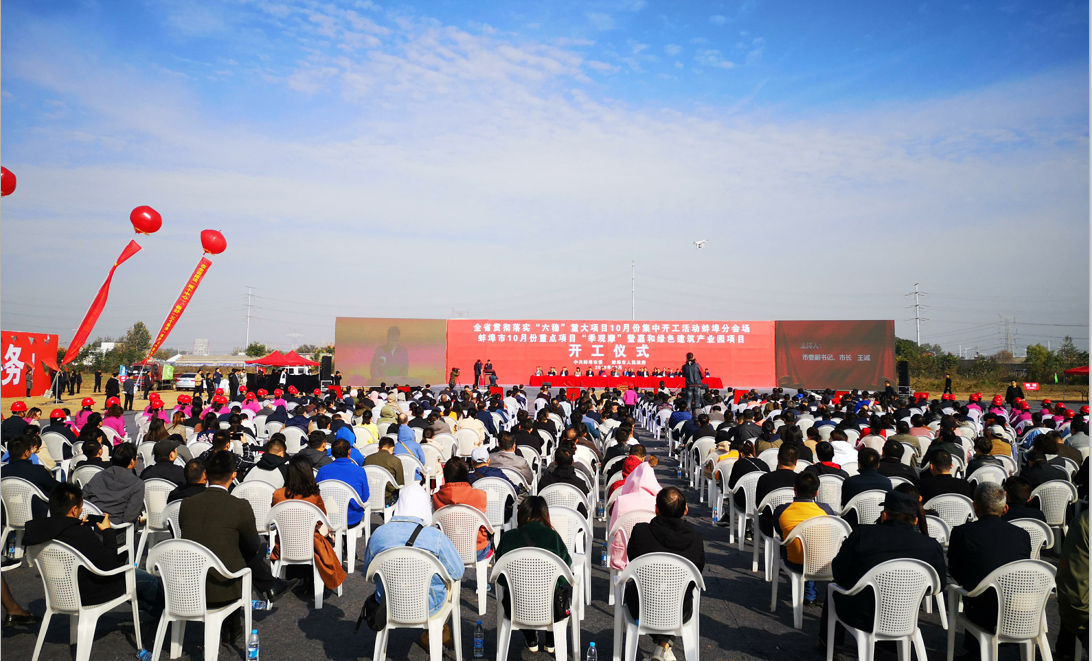 10月28日,安徽水利嘉和建筑工業(yè)產(chǎn)業(yè)園項(xiàng)目現(xiàn)場,彩旗飄揚(yáng),挖掘機(jī)、推土機(jī)整裝待發(fā);綴著橫幅的空飄猶如一串串大紅燈籠高高掛在空中,到處洋溢著喜悅的氛圍。蚌埠市10月份重大項(xiàng)目集中開工暨嘉和綠色建筑產(chǎn)業(yè)園項(xiàng)目開工儀式在此隆重舉行。