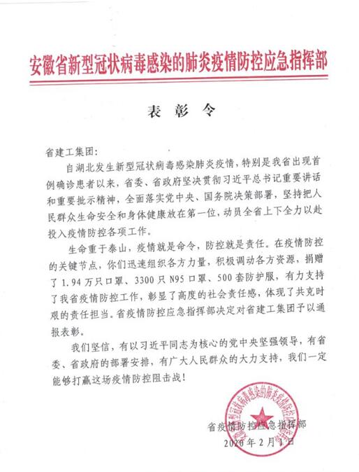 近日,集團(tuán)受到省疫情防控應(yīng)急指揮部通報(bào)表彰,對集團(tuán)響應(yīng)政府號召、加大海外醫(yī)療防疫物資采購力度馳援國內(nèi)疫情防控給予了高度評價(jià)。表彰令指出:“在疫情防控的關(guān)鍵節(jié)點(diǎn),安徽建工集團(tuán)迅速組織各方力量,調(diào)動(dòng)各方資源,有力支持了我省疫情防控工作,彰顯了高度的社會(huì)責(zé)任感,體現(xiàn)了共克時(shí)艱的責(zé)任擔(dān)當(dāng)?!?/FONT>
