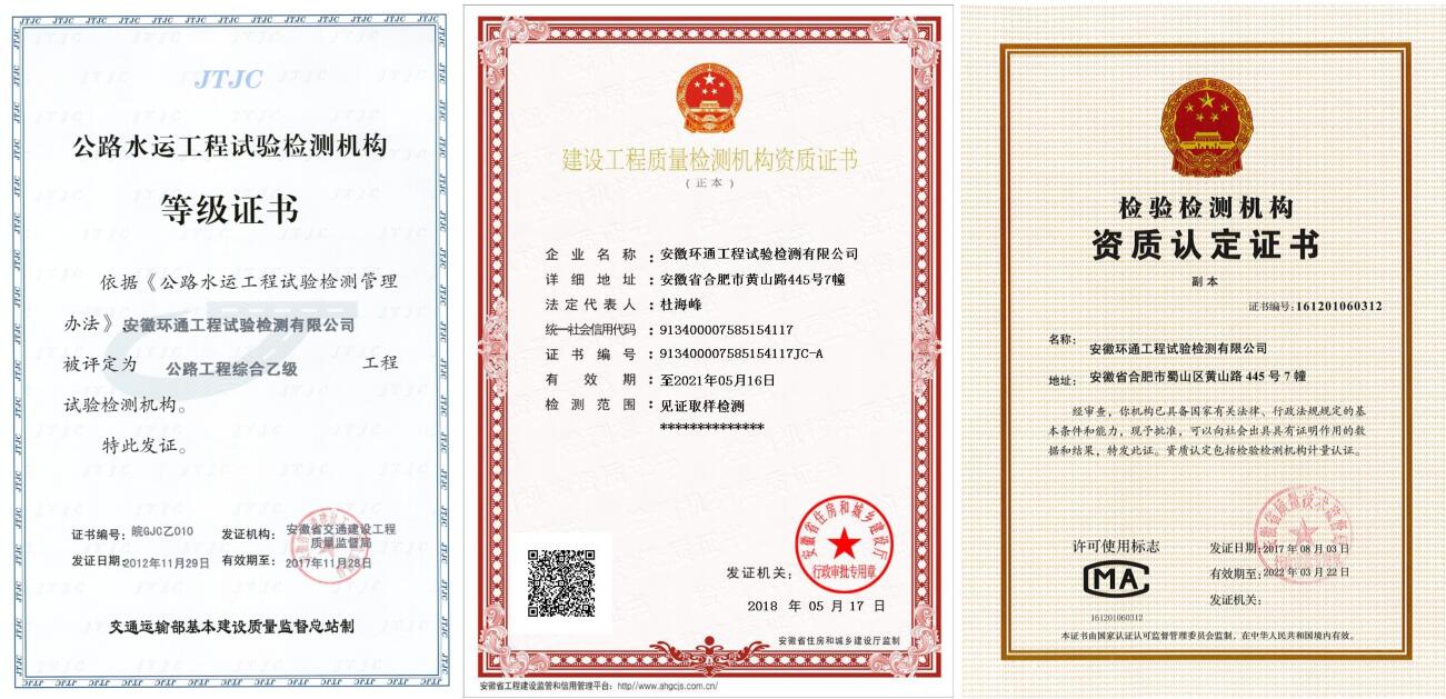 2004年至今,環(huán)通公司累計參與試驗檢測和服務(wù)的項目數(shù)百個,先后參與了安徽省“四縱八橫”所有高速公路和大廣、濟(jì)祁、仁新、延吳、昌寧、蕪湖長江二橋、黃河特大橋等一大批國家高速公路工程的試驗檢測,足跡遍布全國各地。參與試驗檢測和服務(wù)的項目先后榮獲國際橋梁大會(IBC)最高獎—“喬治·理查德森獎”、 中國建設(shè)工程“魯班獎”、“國家優(yōu)質(zhì)工程獎”、中國土木工程“詹天佑獎”、公路交通優(yōu)質(zhì)工程“李春獎”、“全國市政金杯示范工程獎”等眾多國際和國家級大獎。2017年,成功進(jìn)入合肥市軌道交通市場,承擔(dān)四號線土建施工和原材料試驗檢測,在軌道交通試驗檢測領(lǐng)域取得了突破,彌補(bǔ)了安徽路橋在軌道交通領(lǐng)域試驗檢測的空白。
