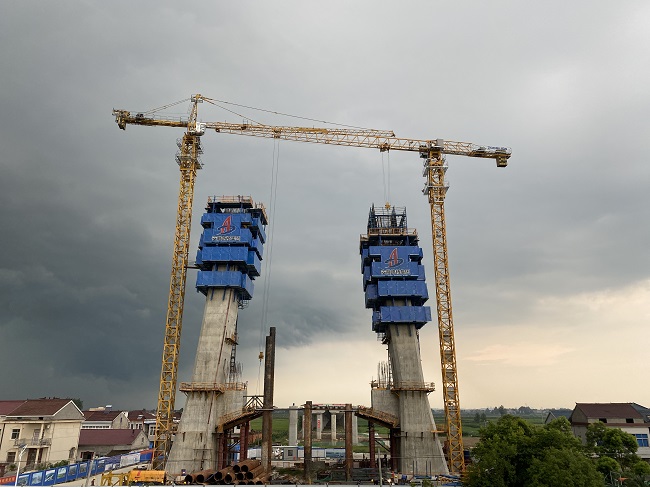 G347PPP楊灣河特大橋主墩兩岸主塔分別進(jìn)入到第五節(jié)和第六節(jié)施工,按照施工方案要求,主塔第一節(jié)到第五節(jié)之間共有二道連接系和一道主動(dòng)支撐施工。