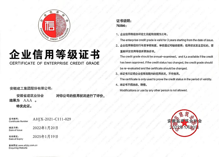 安徽建工集團(tuán)作為省屬大型國有上市企業(yè),秉承“創(chuàng)造空間藝術(shù),成就人文生活”的企業(yè)使命,堅(jiān)守“誠信為本、敬業(yè)至上”的企業(yè)核心價(jià)值觀,恪守“重合同、守信譽(yù)”和“質(zhì)量第一、用戶至上”服務(wù)宗旨,強(qiáng)化信用體系建設(shè),加強(qiáng)項(xiàng)目履約管理,樹立良好品牌形象。此次獲評(píng)AAA級(jí)信用企業(yè),是繼中國建筑業(yè)協(xié)會(huì)“建筑業(yè)AAA級(jí)信用企業(yè)” “中企聯(lián)2020年第一批AAA級(jí)信用企業(yè)”“中國承包商80強(qiáng)”“納稅信用A級(jí)納稅人”后的誠信體系建設(shè)又一新成果。