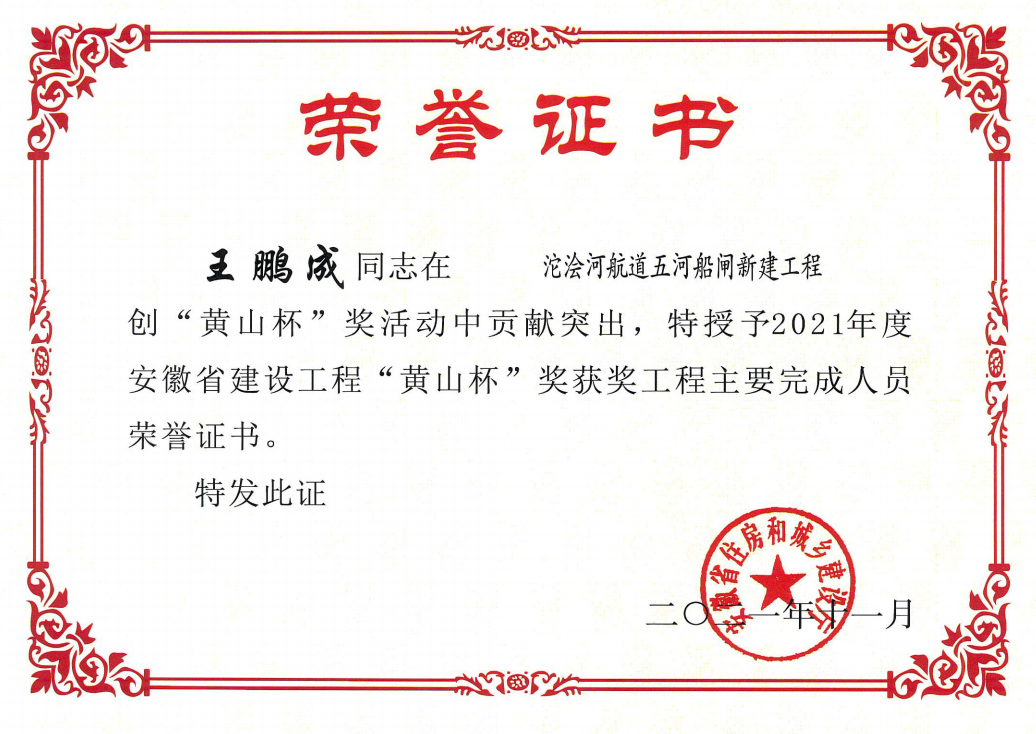 在參與五河船閘04標項目建設(shè)的過程中,他在做好施工現(xiàn)場管理工作的同時,更是以積極主動的態(tài)度,與地方主管部門建立了良好的關(guān)系,確保了桿線遷移等關(guān)鍵工作順利進行,極大提升了項目推進效率。在項目進入后期階段后,他主動與終審人員溝通對接,成功將審減額從初審的240萬元大幅減少至終審的40萬元,這不僅為項目帶來了經(jīng)濟效益,也充分體現(xiàn)出他的專業(yè)能力和敬業(yè)精神。2021年,五河船閘項目被評為省優(yōu)質(zhì)工程獎,他本人也榮獲了“黃山杯”主要完成人員榮譽稱號。