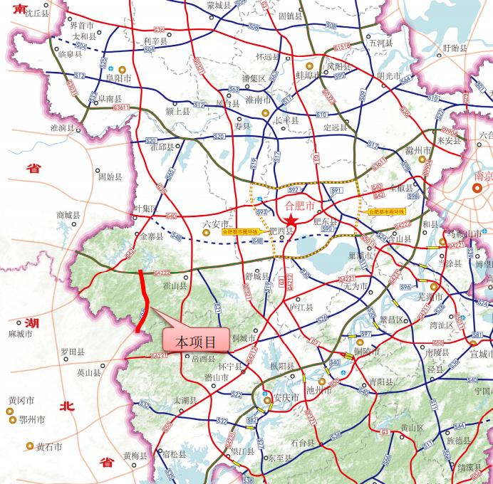 該項目呈南北走向,總體位于六安市金寨縣及霍山縣境內(nèi)。路線全長約45.726公里,為山嶺重丘區(qū)、全封閉、雙向四車道高速公路,設計速度100公里/小時,路基寬度26米。項目估算總投資約72.89億元,建設期3年、運營期(含收費期)暫定30年。