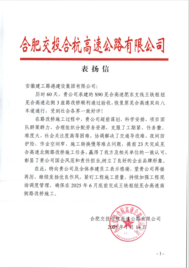 近日,建工路港S90蕪合高速肥東支線路基項(xiàng)目收到合肥交投合杭高速公路有限公司的表揚(yáng)信。
