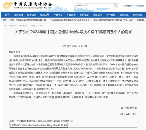 “中國交通運(yùn)輸協(xié)會科學(xué)技術(shù)獎”是由國家科學(xué)技術(shù)獎勵工作辦公室批準(zhǔn)設(shè)立,旨在獎勵中國交通運(yùn)輸領(lǐng)域中做出突出貢獻(xiàn)的單位和個人,是國家科技獎勵的重要組成部分,被業(yè)內(nèi)譽(yù)為“全國交通運(yùn)輸行業(yè)最高科技獎”。