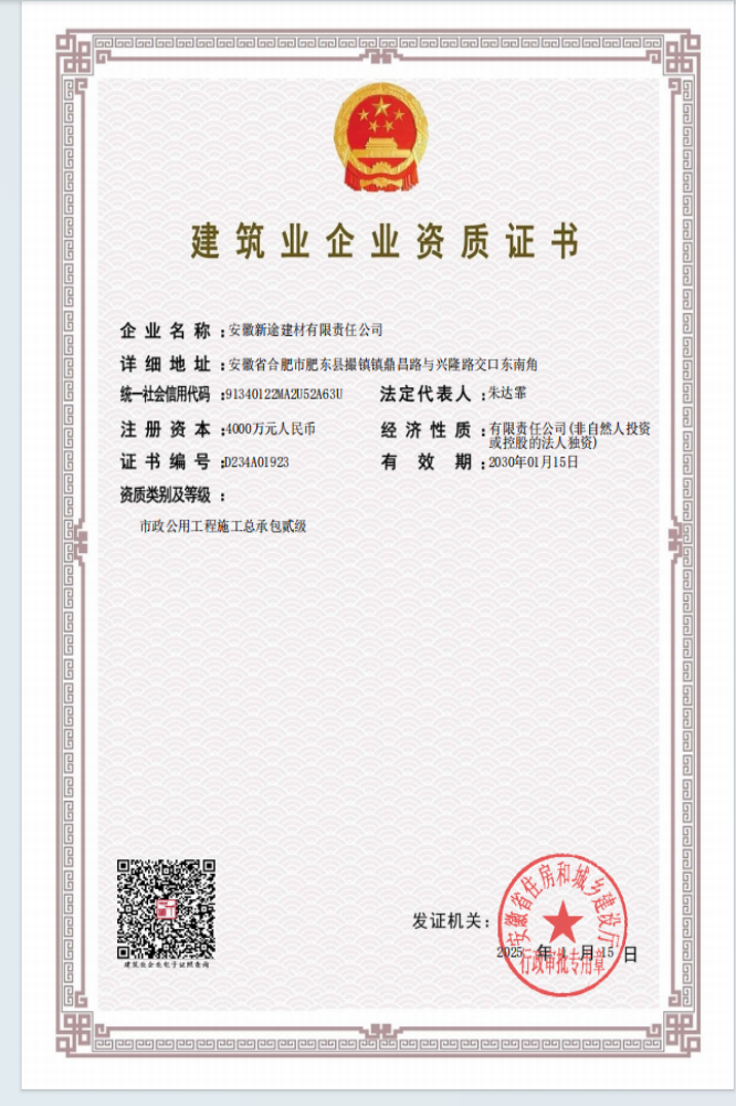 安徽新途建材有限責(zé)任公司喜獲安徽省住房和城鄉(xiāng)建設(shè)廳正式批準(zhǔn),市政公用工程施工總承包二級資質(zhì)順利通過審核,標(biāo)志著新途建材在市政公用工程領(lǐng)域邁上了新的臺(tái)階,市場競爭力得到顯著提升,為公司的業(yè)務(wù)范圍拓展奠定了堅(jiān)實(shí)的基礎(chǔ)。