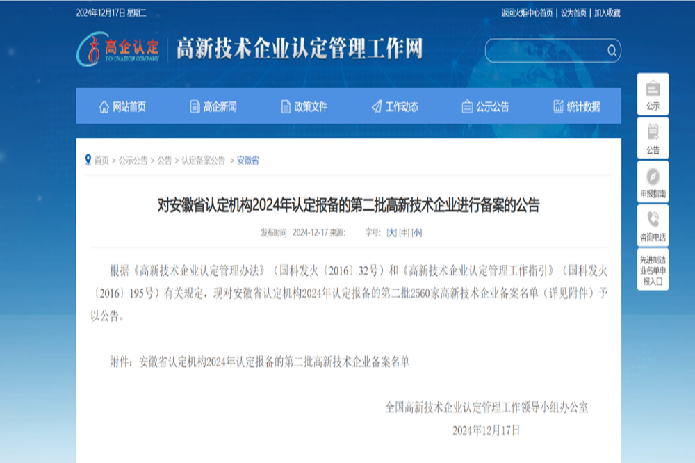 國家高新技術(shù)企業(yè)認(rèn)定管理工作網(wǎng)發(fā)布《對安徽省認(rèn)定機(jī)構(gòu)2024年認(rèn)定報(bào)備的第二批高新技術(shù)企業(yè)進(jìn)行備案的公告》,建工建材安徽瑞特公司名列其中,成功獲評國家“高新技術(shù)企業(yè)”。