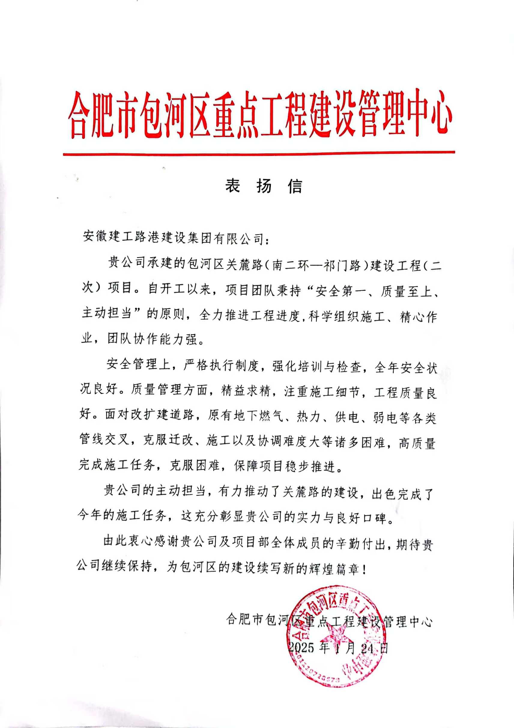 日前,建工路港包河區(qū)關(guān)麓路建設(shè)工程項(xiàng)目收到了來(lái)自業(yè)主的表?yè)P(yáng)信,對(duì)項(xiàng)目團(tuán)隊(duì)在工程建設(shè)中的出色表現(xiàn)給予了高度贊揚(yáng)。
