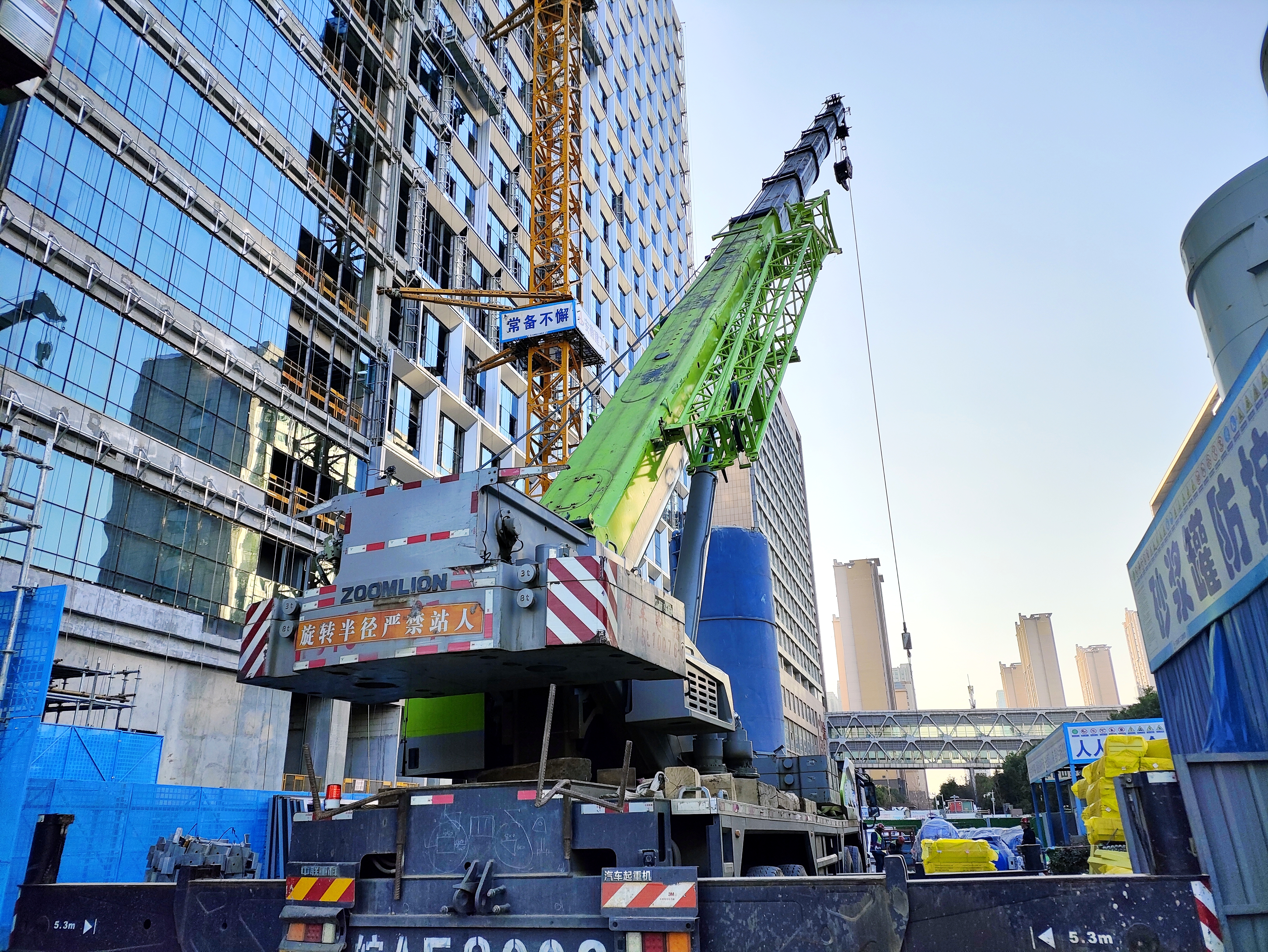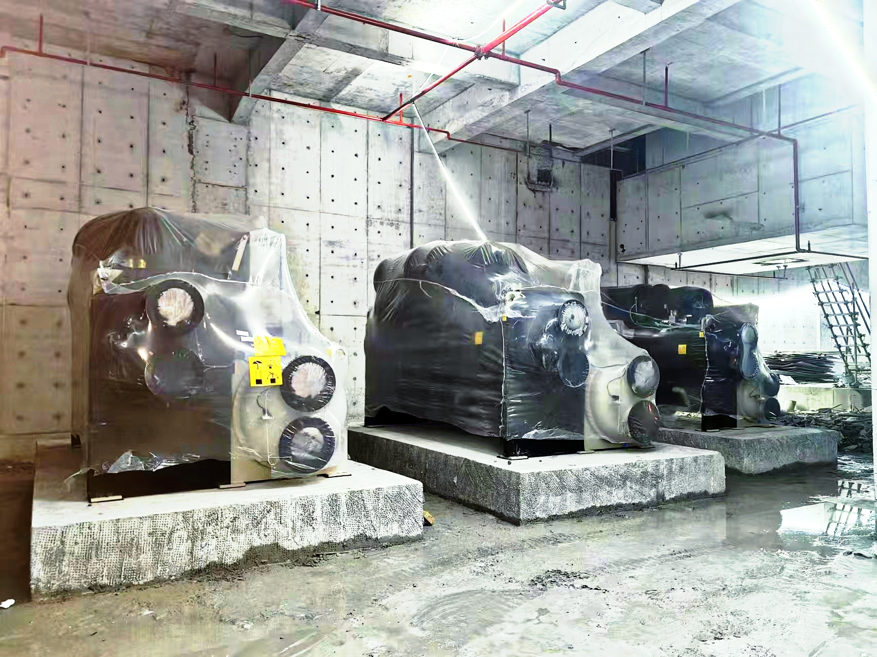 清晨7時(shí)許,施工現(xiàn)場已是一片繁忙而有序的景象。醒目的安全警戒線早已拉設(shè)完畢,擴(kuò)音器中不斷傳來清晰而有力的安全提示語,為整個(gè)施工現(xiàn)場營造出濃厚的安全生產(chǎn)氛圍。隨著1臺(tái)130噸級重型吊車和數(shù)臺(tái)重型叉車的準(zhǔn)時(shí)進(jìn)場,吊裝作業(yè)正式拉開了帷幕。在管理人員的精準(zhǔn)引導(dǎo)下,吊車巨大的起重臂緩緩升起,宛如一條鋼鐵巨龍般騰空而上,將一套套冷卻設(shè)備從吊裝口穩(wěn)穩(wěn)“銜”起,再精準(zhǔn)無誤地落到指定位置。機(jī)房內(nèi),兩臺(tái)叉車在工作人員的協(xié)同配合下靈活穿梭,將設(shè)備準(zhǔn)確安置到預(yù)定的安裝位置。整個(gè)吊裝過程井然有序,緊張而不失從容。夜幕降臨,寒風(fēng)刺骨,但現(xiàn)場依然是一片熱火朝天的大干景象,大伙兒似乎都已經(jīng)忘卻了疲憊和寒冷。終于,經(jīng)過全體人員近12個(gè)小時(shí)的不懈奮戰(zhàn)和連續(xù)作業(yè),所有重型設(shè)備均成功吊裝到位。隨著吊車和叉車有序撤離施工現(xiàn)場,本次吊裝作業(yè)圓滿完成。