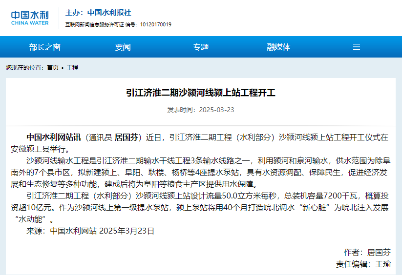 3月18日,建工水利承建的引江濟淮二期工程(水利部分)沙潁河線潁上站工程開工儀式正式舉行,受到中國水利報、安徽日報、安徽國資、中安在線、阜陽日報、阜陽電視臺等主流媒體關(guān)注報道。