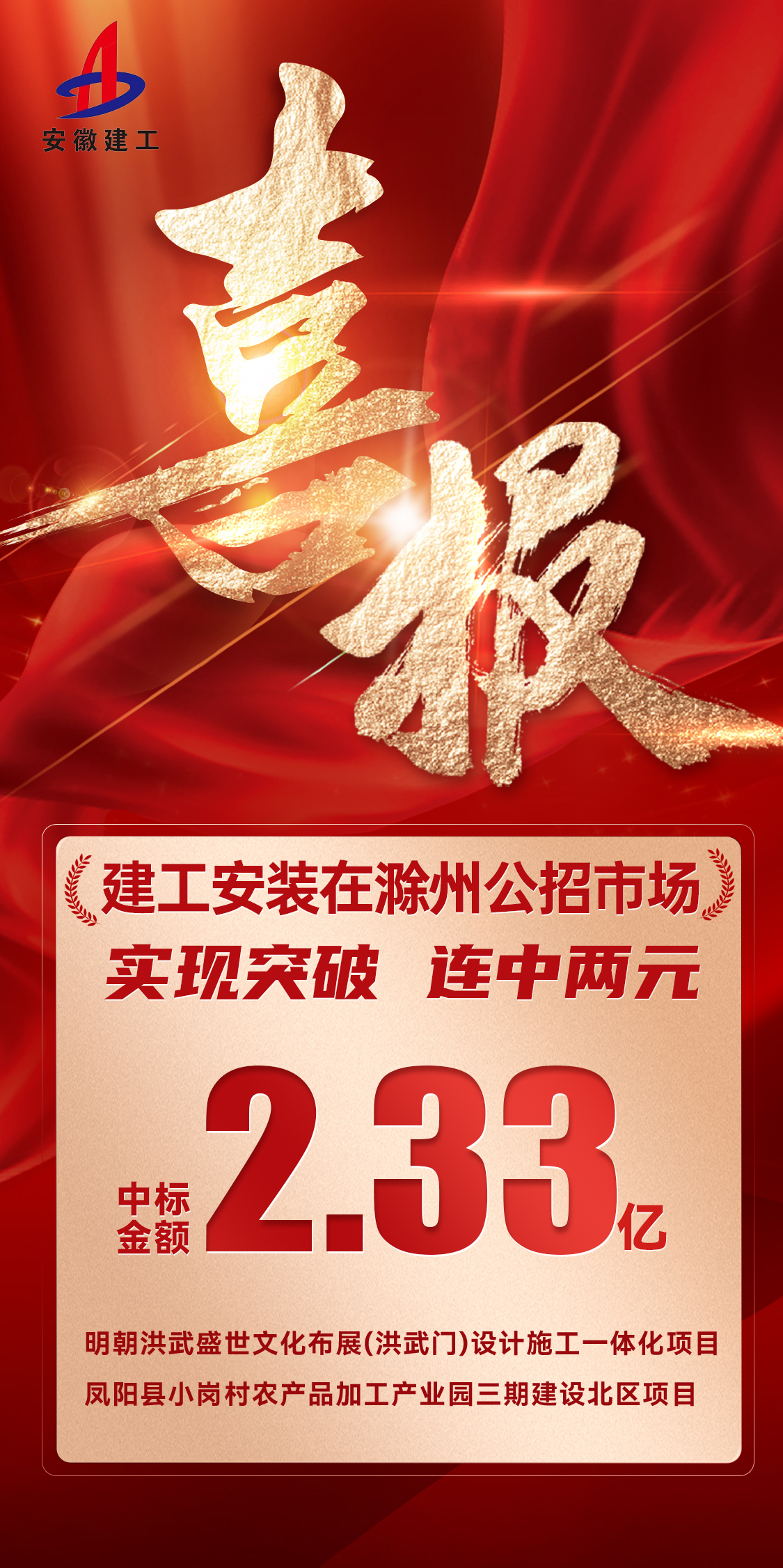 近日,建工安裝連中兩標(biāo),成功攬獲明朝洪武盛世文化布展(洪武門)設(shè)計(jì)施工一體化項(xiàng)目以及鳳陽縣小崗村農(nóng)產(chǎn)品加工產(chǎn)業(yè)園三期建設(shè)北區(qū)項(xiàng)目,中標(biāo)金額2.33億元,在滁州屬地市場實(shí)現(xiàn)新突破。