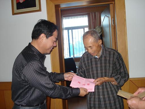 在中華人民共和國成立60周年到來之際,集團(tuán)公司副董事長李長斌率領(lǐng)集團(tuán)辦公室主任陳萍、安徽建機(jī)公司黨委書記王愛國等一行6人,于9月23日上午驅(qū)車前往安徽建機(jī)公司離休老干部——新四軍老戰(zhàn)士稽友三同志家中看望和慰問。李長斌副董事長非常關(guān)心稽老的身體健康和生活情況,和老人親切交流,噓寒問暖,代表集團(tuán)公司和集團(tuán)黨委向稽老送去慰問信、慰問金,并送上節(jié)日的關(guān)懷和祝福。